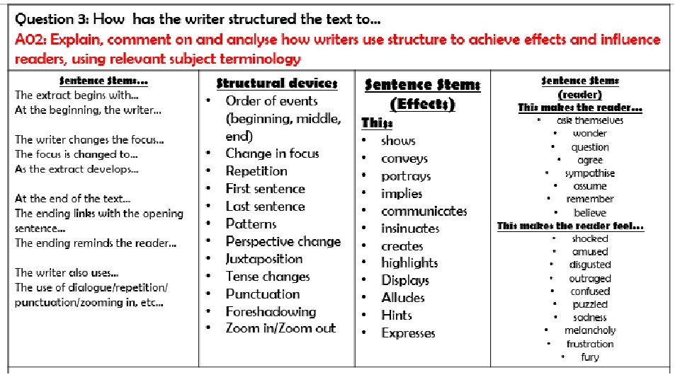 PAPER 1 QUESTION 3 HOW LONG SHOULD YOU SPEND ON THE QUESTION? 10 MINUTES READ THE QUESTION • Make sure you check whether the question wants you to focus on the whole of the source or part of the source. • Next to each paragraph, note what the focus is of each paragraph. • Focus on the beginning, middle and end. • Think about WHY the writer has chosen to structure the text this way.