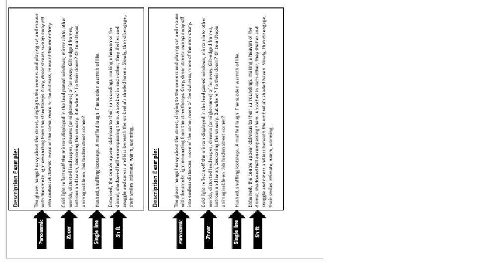 Describing a character or place using SHOW DON’T TELL Brief version - ‘TELLS’ the reader Sally is disorganised (weak writing) Sally, who worked in a newspaper office, was very disorganized. Detailed version - ‘SHOWS’ the reader Sally is disorganised (effective writing) As she sat down at her desk, Sally heaped a pile of letters and files onto the top of her in-tray. She Brief version – ‘TELLS’ the reader the street was covered in snow (weak writing) When I woke in the morning, I saw my street was covered in snow. Detailed version – ‘SHOWS’ the reader the street was covered in snow (effective writing) I emerged from beneath my duvet to see that my street was covered in a white, glistening