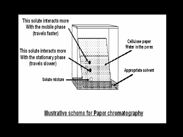 Principle of Paper Chromatography: • Method of separating and identifying both colored and colorless mixtures. • Mixtures can be solids, liquids or gases but their components must be able to dissolve in the same solvent to different extents. * Generally involves 2 phases: 1. stationary phase solid support e. g. water on paper 2. mobile phase solvent or a gas