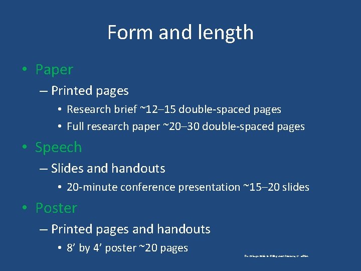 Form and length • Paper – Printed pages • Research brief ~12– 15 double-spaced pages • Full research paper ~20– 30 double-spaced pages • Speech – Slides and handouts • 20 -minute conference presentation ~15– 20 slides • Poster – Printed pages and handouts • 8’ by 4’ poster ~20 pages The Chicago Guide to Writing about Numbers, 2 nd edition.
