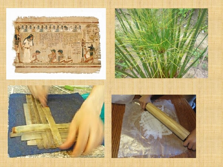 Výroba papyrusu • Steblá rastliny Cyperus papyrus sa zbavili kôry a lyka • Snehobiela dreň sa porezala na tenké prúžky • Tie sa navrstvili tesne vedľa seba, aby sa neprekrývali • Druhá vrstva sa ukladala priečne • Vrstvy sa máčali vo vode niekoľko dní • Lisovanie, tlačenie a hladenie, orezanie