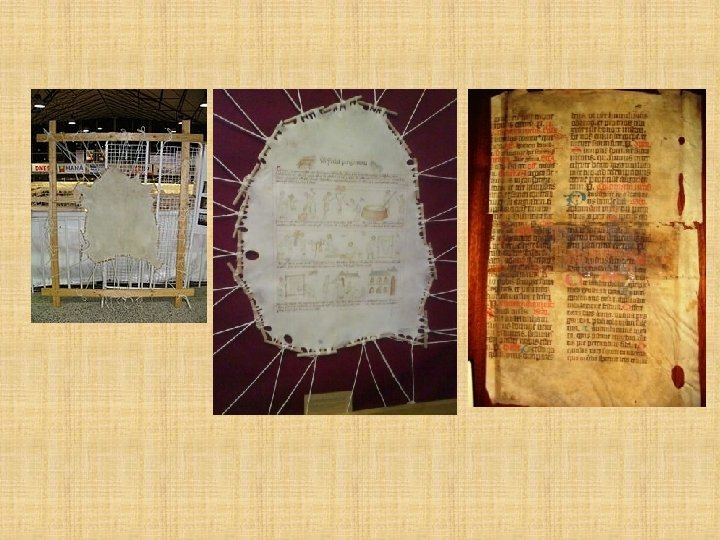 Pergamen • 2. st pr. n. l. , podľa miesta vzniku Pergamon • vyrobený zo zvieracej kože - ovčej, kozej, teľacej • Kvalitnejší ako papyrus, ale drahší • Písalo sa naň obojstranne • Písmo sa niekedy zmylo a prepísalo – palimpsesty • Najst. pamiatka – Kniha mŕtvych z Káhiry