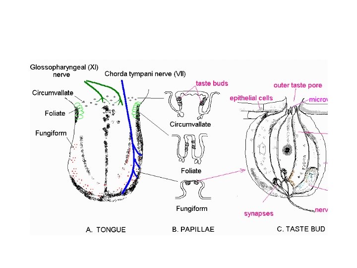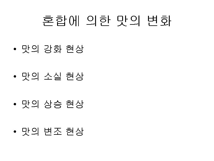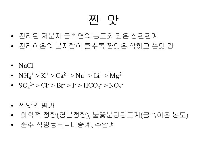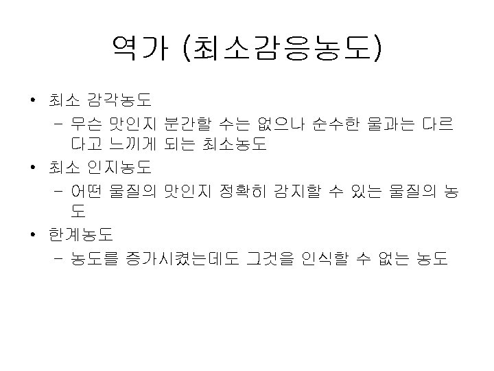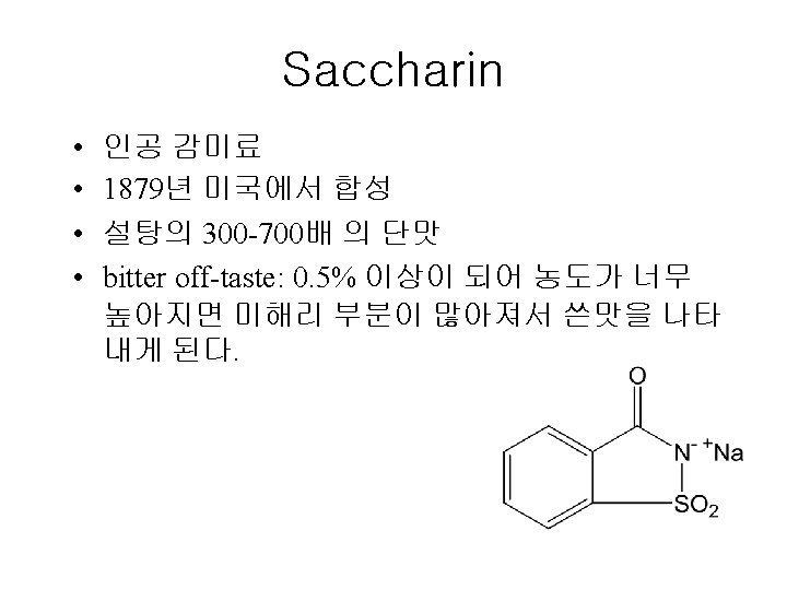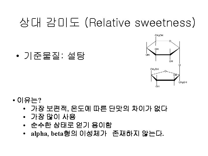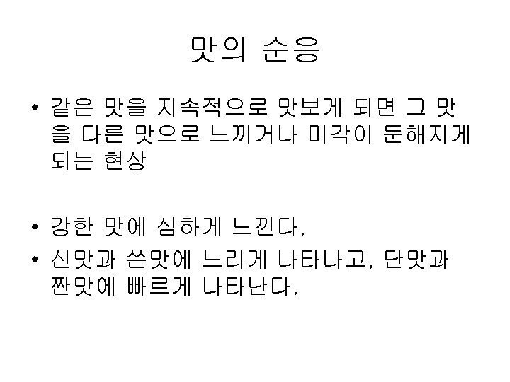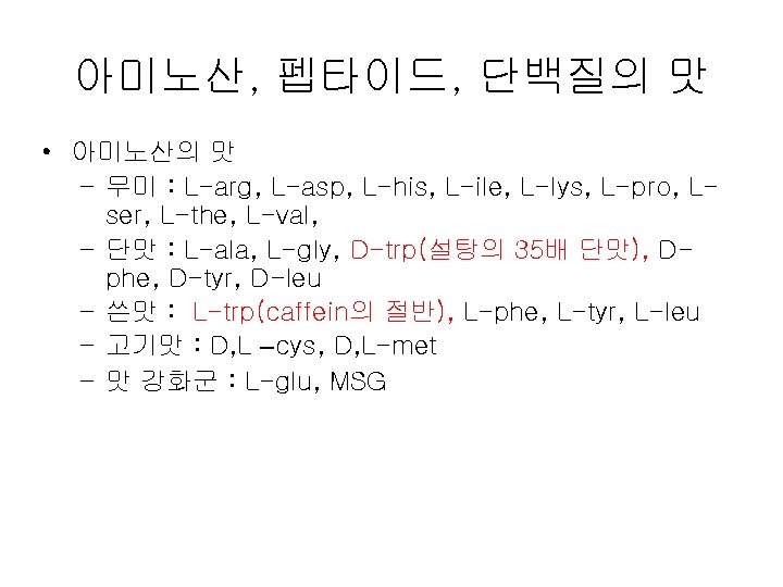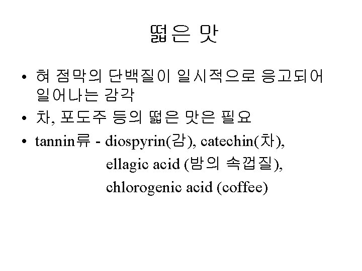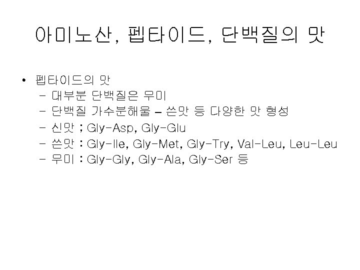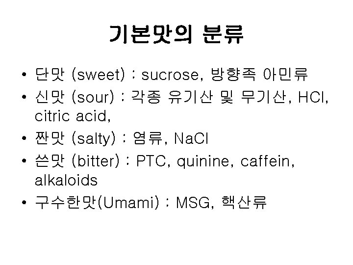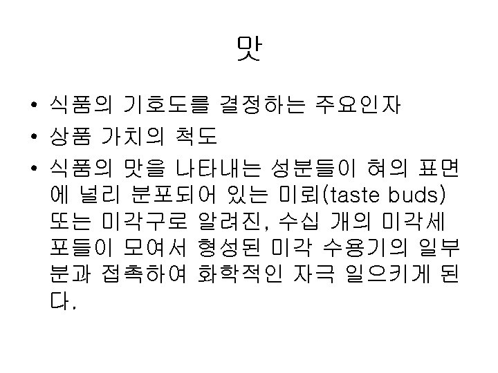 Papillae Fungiform Curcumvallate Foliate www ACLS 123 com Slides: 35 Download presentation Papillae(혀의 유두) Fungiform Curcumvallate Foliate www. ACLS 123. com TASTE. mov 식품의 단맛 성분 • 단맛을 가진 화합물들 - 당류: glucose, fructose, maltose, lactose, sucrose - polyhydroxy alcohol: ethylene glycol, glycerol, erythritol, mannitol - aromatic amines: p-nitro-o-toluidine, dulcin - aromatic nitro compounds: m-nitrobenzoic acid, 4 -alkoxy-3 -amino nitrobenzene - beryllium 또는 납(lead)의 염류 단맛 수용체의 모델(AH-B 학설) • Shallenberger and Acree (1967) 상대 감미도 Compound Sucrose Fructose High Fructose Corn Syrup Glucose Galactose Maltose Lactose Rating 100 140 120 -160 70 -80 35 30 -50 20 상대 감미도 Sucrose = 1 Compound Rating Saccharin Stevioside Cyclamate 500 X 300 X 30 X Aspartame 180 X Acesulfame 200 X Sucralose 600 X 감칠 맛 • monosodium L-glutamate(MSG): 다시마(sea tangle)의 열수 추출물에서 분리, 향미 강화제 (flavor intensifier) 감칠맛 • L-glutamate(MSG), disodium 5'-inosinate(IMP), disodium 5'-guanylate(GMP) 매 운 맛 • • • hot taste, 자극적인 맛(pungent taste) 고통스런 맛(pain feeling) 식품의 풍미 증진, 식욕 증진 고추의 캅사이신 생강의 shogaol, gingerone, gingerol 후추의 piperine, chavicine 미맹 • Phenyl thiocarbamide (or phenyl thiourea, PTC) • Phenethoxyl thiocarbamide (or phenethoxyl thiourea)의 쓴맛을 인식못하는 경우 • 유전적이며 20% 정도