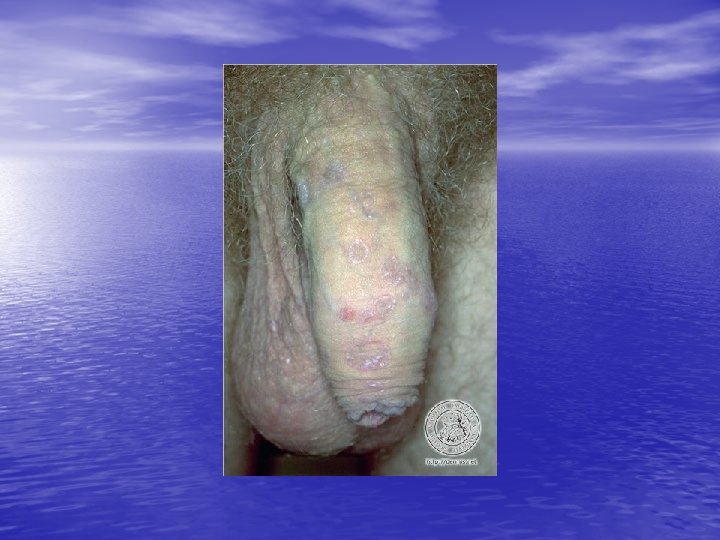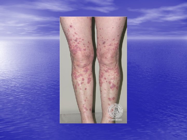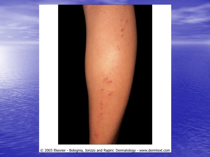 Physical examination • Skin lesions: Violaceous, shiny papules, with white lines ( Wickham’s striae). Polygonal or oval lesions. Grouped, linear ( isomorphic phenomenon), anular or disseminated scattered discrete lesions when generalized. In dark-skinned individuals, post-inflammatory hyperpigmentation is common. • Clinical variants: Hypertrophic, follicular, vesicular, actinicus, ulcerative • Mucous membranes: 40 -60%, reticular, erosive or ulcerative • Genitalia: Papular, annular or erosive • Hair and nails: Scalp (scarring alopecia), nail ( pterygium formation!, longitidunal ridging, splitting, oncholysis, red lunula, idiopathic atrophy of the nails, yellow nail syndrome, twenty-nail dystrophy) • Nail involvement: %5 -10. Especially in children, it can occur as an initial manifestation!