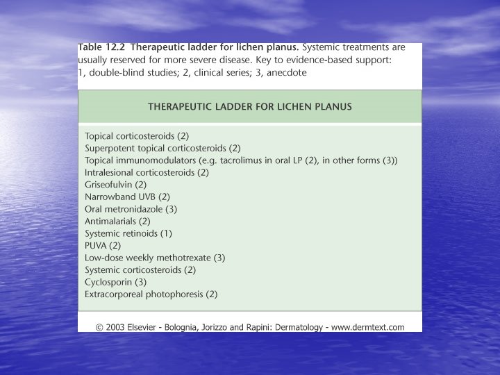Diagnosis and differential diagnosis • Clinical findings confirmed by histopathology • Papular LP: Psoriasis, p. rosea, chronic cutaneous lupus • • • erythematosus, eczema, lichenoid GVHD. Hypertrophic LP: Psoriasis, lichen simplex chronicus, prurigo noularis, kaposi’s sarcoma. Drug-induced LP: Beta-blockers, antimalarials, thiazide diuretics, furosemide, spironolactone, penicillamine, ACE inhibitors, ca channel blockers, NSAİD’s, sulfonylurea Mucous membranes: leukoplakia, candidiasis, hıvassociated hairy leukoplakia, lupus erythematosus, bite trauma, mucous patches of syphilis, pemfigus vulgaris.