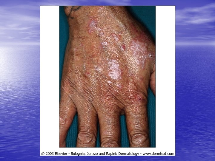 Epidemiology and etiology • • Age of onset: 30 to 60 years, females = males Race: Hypertrophic LP more common in blacks, linear LP mor common in children. Lichenoid tissue reaction !: Vacuolar alteration of the epidermal basal cells (interface dermatitis) + band-like infiltrate of primarily lymphocytes in the papillary dermis. Etiology: Idiopathic in most cases but cell-mediated immunity (keratinocyte apoptosis) plays a major role. Drugs, metals (gold, mercury), or infection ( HCV ). Exposure to a number of exogenous agents ( viruses, medications, contact allergens) Hepatitis-associated LP: HCV (%1. 6 -%20), HBV immunization, primary biliary cirrhosis %0. 4 - %5 (%1 -2) of patients with oral - erosive or ulcerative - LP will develop oral SCC.