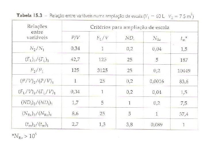 Exercício Considere a ampliação de escala de uma fermentação de um biorreator de 10 L para um outro de 10. 000 L. O fermentador menor apresenta uma relação HL/DT igual a 3. O diâmetro da turbina equivale a 30% do diâmetro do tanque. A velocidade de agitação é de 500 rpm e são empregadas 3 turbinas tipo Rushton. Determine as dimensões do fermentador maior e a velocidade de agitação para: a) constância da relação P/V; b) constância da velocidade da extremidade da turbina; c) constância do número de Reynolds.