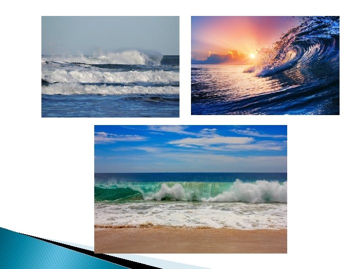 1) OLAS: � Este movimiento se origina por la acción del VIENTO, en el mismo sentido en el que sopla. Cuando las olas se acercan a la orilla de las playas se vuelven aún más grandes debido a la poca profundidad de la costa.