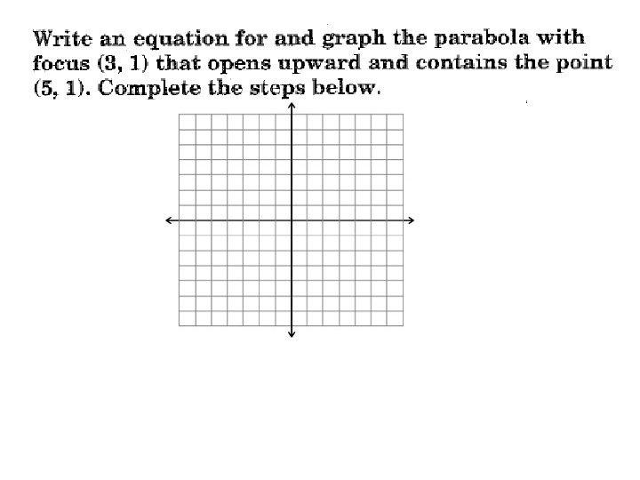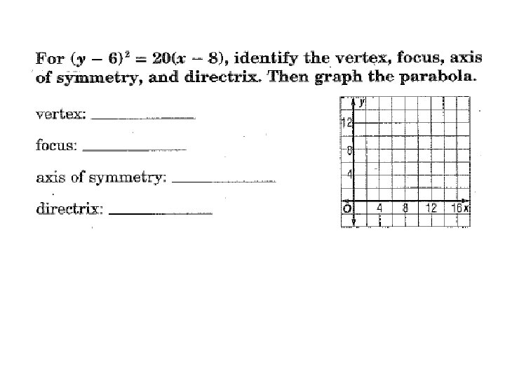 Graphing a Parabola y 2 - 10 x + 4 y - 16 = 0 y 2 + 4 y + _____ 4 = 10 x + 16 + _____ 4 (y + 2)2 = 10 x + 20 (y + 2)2 = 10(x + 2) Horizontally oriented (right) Vertex @ (-2, -2) Line of Symmetry y = -2 P = 2. 5 focus @ ( 0. 5, -3) Directrix X = - 4. 5
