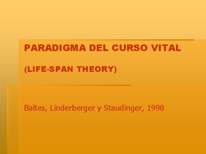 PARADIGMA DEL CURSO VITAL (LIFE-SPAN THEORY) (Life-Course Sociology / Life-Span Psychology) Escuela Germana Max Plank Institute of Human Development P. Baltes, Linderberger y U. Staudinger, 1968, 1998 K. W. Schaie (1965) J. R. Nesselroade (1973) Riegel (1973) Havighurst (1948) Birren (1961, 2000) Thomae (1974, 1993, 2001) U. Lehr (1993, 1994) G. Labouvie-Vief (1990) Dulcey-Ruiz (2002) Neugarten (1968, 1996)