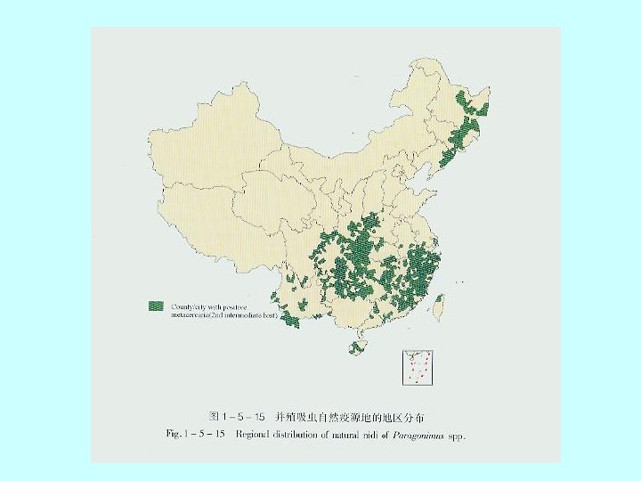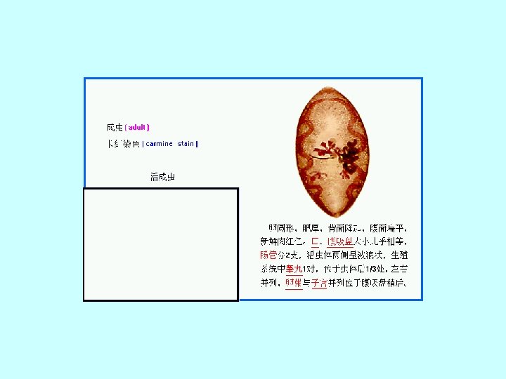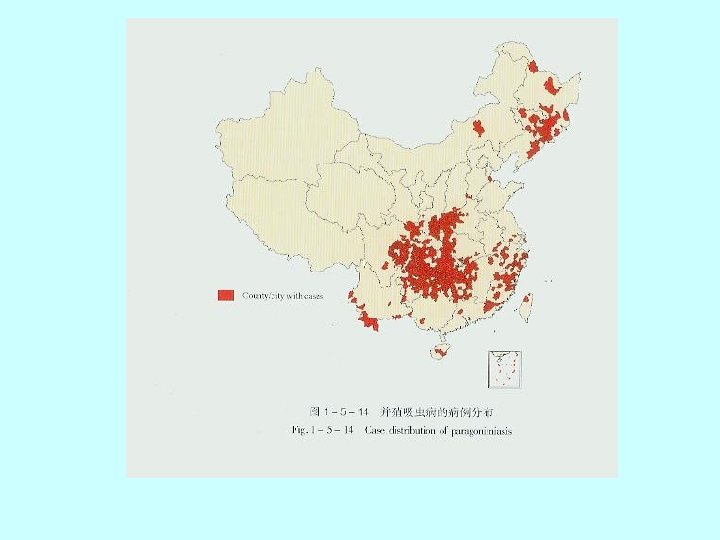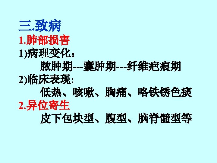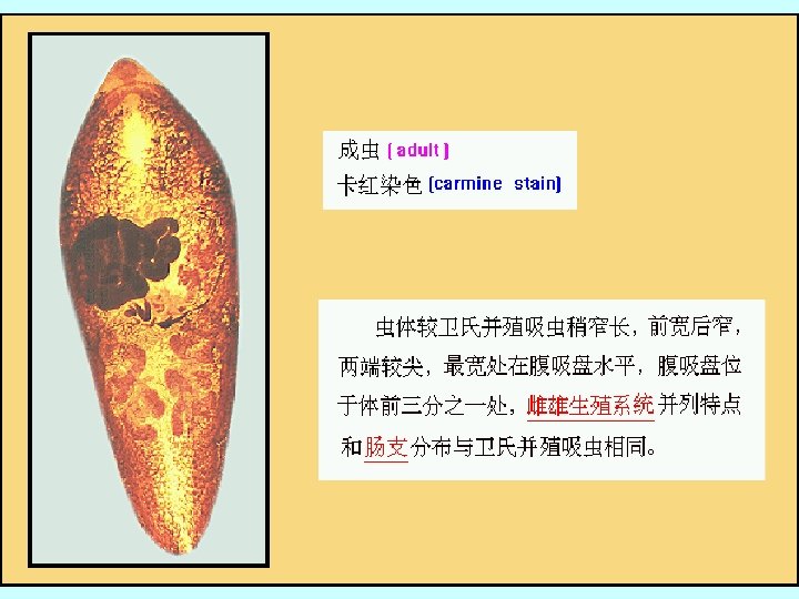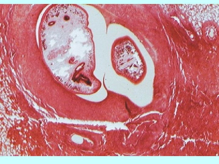A cross-section of Paragonimus sp in lungs. The tegument is covered with spines which appear reddish in colour. The vitellaria are dark bodies scattered along the periphery. One of the intestinal caeca is also visible.