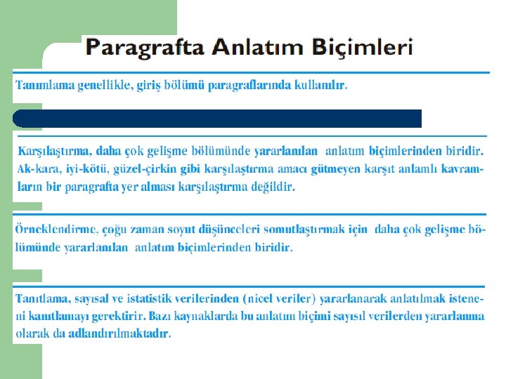 Paragrafta Anlatım Yöntemleri Anlatım: Kişinin zihninde tasarladıklarını, dilin kuralları çerçevesinde sözlü veya yazılı olarak dışa vurması Nesnel anlatım, öznel anlatım, açıklama, öyküleyici anlatım, betimleme, portre, tartışma. . .