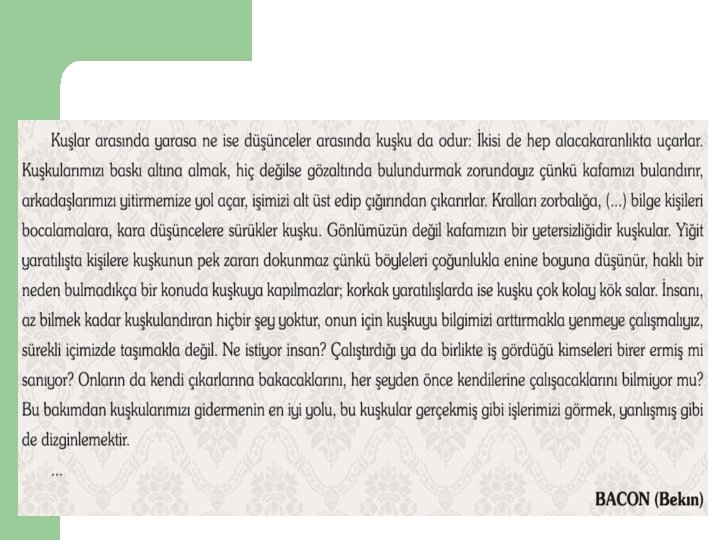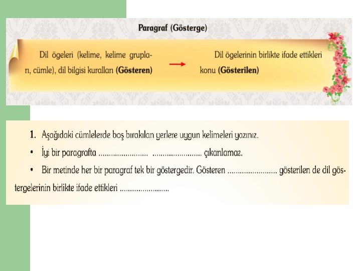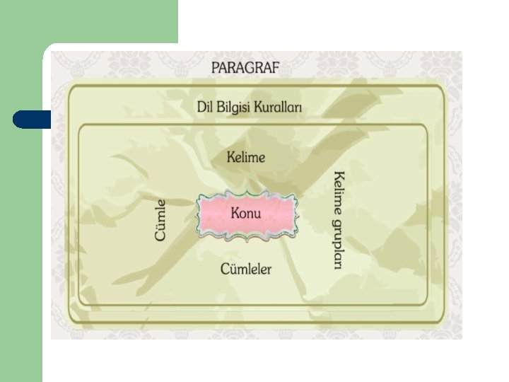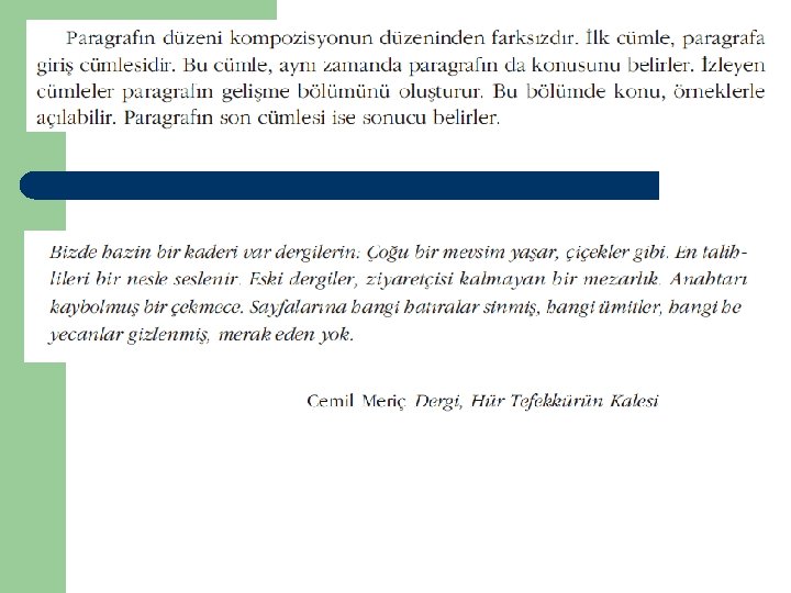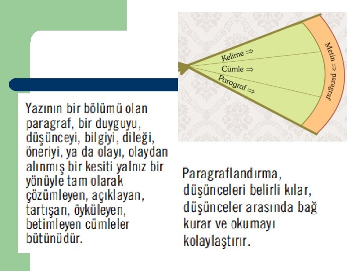 Paragraf nedir? l l l Paragraf bir düşünceyi anlatan cümle grubudur. Paragraflar, bir düşünceden diğerine geçişi göstererek zihnen kavramayı kolaylaştırır. Paragraflar, düşünceleri belirgin kılar. sözcük > cümle > paragraf (kavram birimi) > (yargı birimi) >(düşünce birimi)