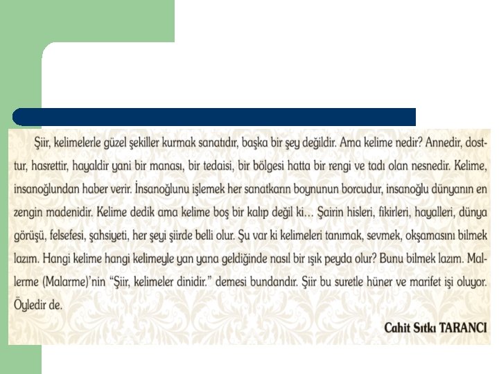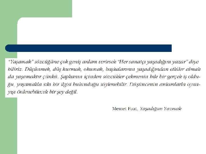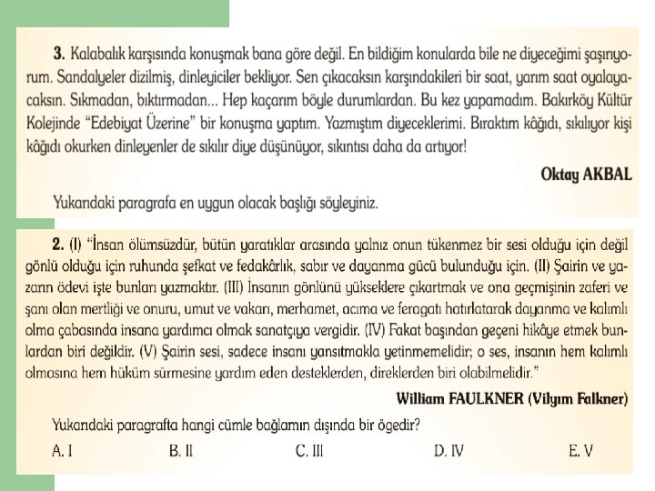 BAZI ALIŞTIRMALAR l l l l Cümle geliştirme yöntemi (kelimeden cümleye) Paragraf ya da metin geliştirme yöntemi (cümleden paragrafa, paragraftan metne) Cümle çözme yöntemi (cümleden kelimeye) Cümle bölme yöntemi Cümle birleştirme / yer değiştirme / sıralama Düzyazıya çevirme Yakın anlamlı alternatifler oluşturma. . .
