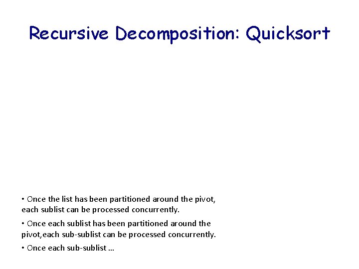 Recursive Decomposition: Quicksort • Once the list has been partitioned around the pivot, each sublist can be processed concurrently. • Once each sublist has been partitioned around the pivot, each sub-sublist can be processed concurrently. • Once each sub-sublist …