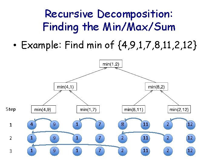 Recursive Decomposition: Finding the Min/Max/Sum • Example: Find min of {4, 9, 1, 7, 8, 11, 2, 12} Step 1 4 9 1 7 8 11 2 12 2 1 9 1 7 2 11 2 12 3 1 9 1 7 2 11 2 12