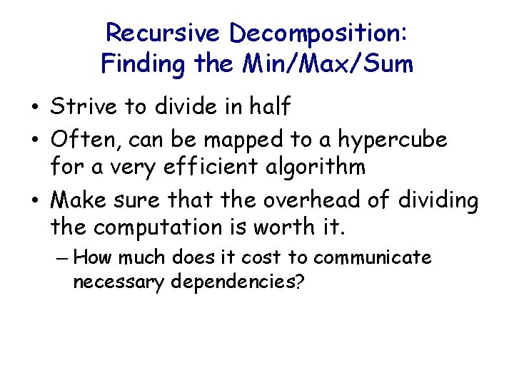 Recursive Decomposition: Finding the Min/Max/Sum • Strive to divide in half • Often, can be mapped to a hypercube for a very efficient algorithm • Make sure that the overhead of dividing the computation is worth it. – How much does it cost to communicate necessary dependencies?