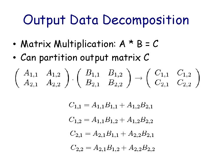 Output Data Decomposition • Matrix Multiplication: A * B = C • Can partition output matrix C