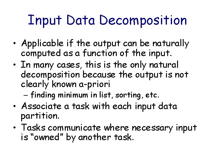 Input Data Decomposition • Applicable if the output can be naturally computed as a function of the input. • In many cases, this is the only natural decomposition because the output is not clearly known a-priori – finding minimum in list, sorting, etc. • Associate a task with each input data partition. • Tasks communicate where necessary input is “owned” by another task.