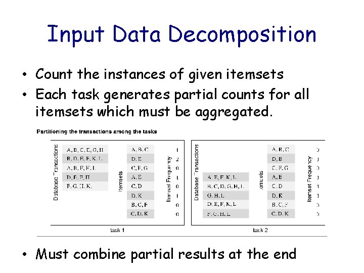 Input Data Decomposition • Count the instances of given itemsets • Each task generates partial counts for all itemsets which must be aggregated. • Must combine partial results at the end