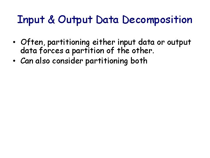Input & Output Data Decomposition • Often, partitioning either input data or output data forces a partition of the other. • Can also consider partitioning both
