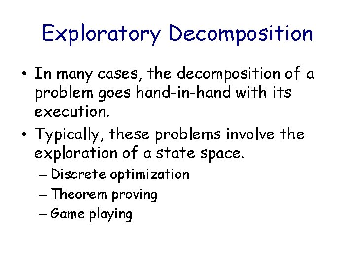 Exploratory Decomposition • In many cases, the decomposition of a problem goes hand-in-hand with its execution. • Typically, these problems involve the exploration of a state space. – Discrete optimization – Theorem proving – Game playing