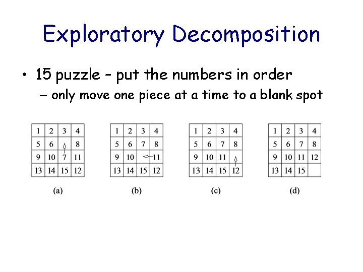Exploratory Decomposition • 15 puzzle – put the numbers in order – only move one piece at a time to a blank spot