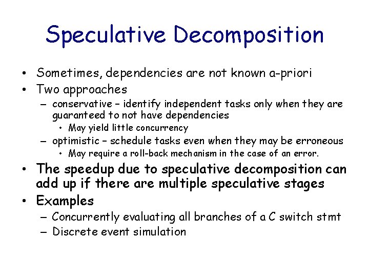 Speculative Decomposition • Sometimes, dependencies are not known a-priori • Two approaches – conservative – identify independent tasks only when they are guaranteed to not have dependencies • May yield little concurrency – optimistic – schedule tasks even when they may be erroneous • May require a roll-back mechanism in the case of an error. • The speedup due to speculative decomposition can add up if there are multiple speculative stages • Examples – Concurrently evaluating all branches of a C switch stmt – Discrete event simulation