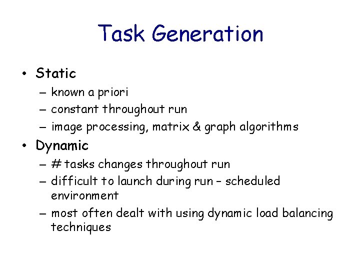 Task Generation • Static – known a priori – constant throughout run – image processing, matrix & graph algorithms • Dynamic – # tasks changes throughout run – difficult to launch during run – scheduled environment – most often dealt with using dynamic load balancing techniques