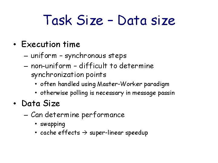 Task Size – Data size • Execution time – uniform – synchronous steps – non-uniform – difficult to determine synchronization points • often handled using Master-Worker paradigm • otherwise polling is necessary in message passin • Data Size – Can determine performance • swapping • cache effects super-linear speedup