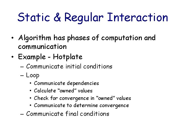 Static & Regular Interaction • Algorithm has phases of computation and communication • Example - Hotplate – Communicate initial conditions – Loop • • Communicate dependencies Calculate “owned” values Check for convergence in “owned” values Communicate to determine convergence – Communicate final conditions