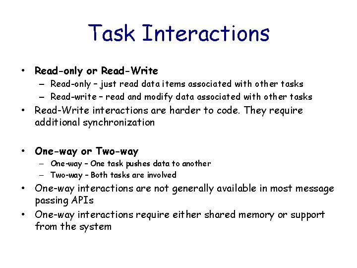 Task Interactions • Read-only or Read-Write – Read-only – just read data items associated with other tasks – Read-write – read and modify data associated with other tasks • Read-Write interactions are harder to code. They require additional synchronization • One-way or Two-way – One task pushes data to another – Two-way – Both tasks are involved • One-way interactions are not generally available in most message passing APIs • One-way interactions require either shared memory or support from the system