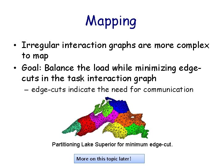 Mapping • Irregular interaction graphs are more complex to map • Goal: Balance the load while minimizing edgecuts in the task interaction graph – edge-cuts indicate the need for communication Partitioning Lake Superior for minimum edge-cut. More on this topic later!