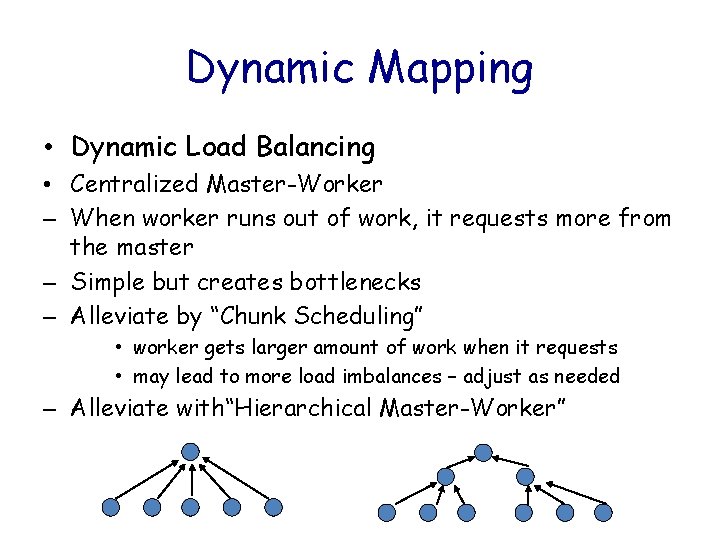 Dynamic Mapping • Dynamic Load Balancing • Centralized Master-Worker – When worker runs out of work, it requests more from the master – Simple but creates bottlenecks – Alleviate by “Chunk Scheduling” • worker gets larger amount of work when it requests • may lead to more load imbalances – adjust as needed – Alleviate with“Hierarchical Master-Worker”