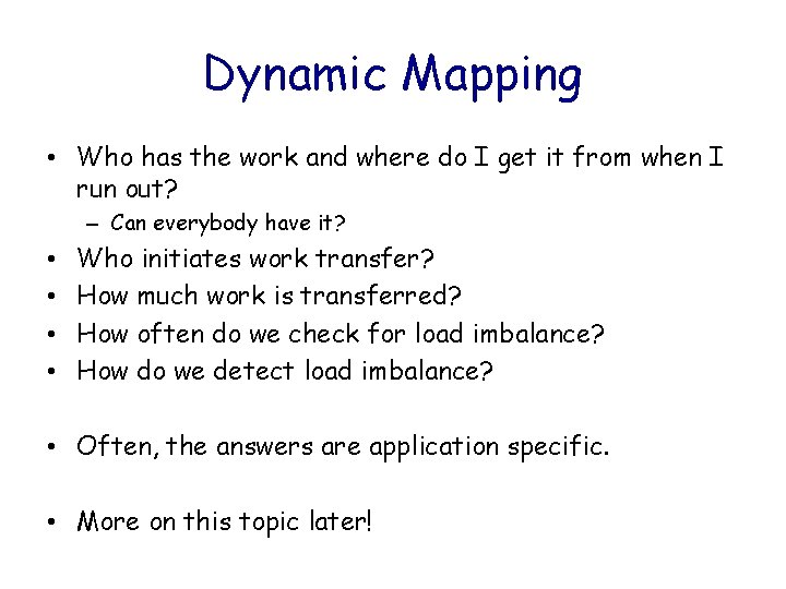 Dynamic Mapping • Who has the work and where do I get it from when I run out? – Can everybody have it? • • Who initiates work transfer? How much work is transferred? How often do we check for load imbalance? How do we detect load imbalance? • Often, the answers are application specific. • More on this topic later!