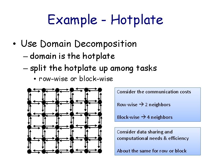 Example - Hotplate • Use Domain Decomposition – domain is the hotplate – split the hotplate up among tasks • row-wise or block-wise Consider the communication costs Row-wise 2 neighbors Block-wise 4 neighbors Consider data sharing and computational needs & efficiency About the same for row or block