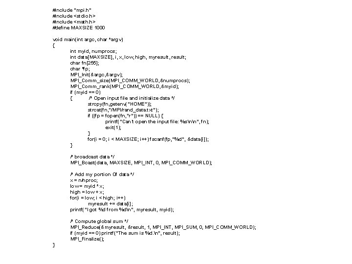 #include “mpi. h” #include <stdio. h> #include <math. h> #define MAXSIZE 1000 void main(int argc, char *argv) { int myid, numprocs; int data[MAXSIZE], i, x, low, high, myresult, result; char fn[255]; char *fp; MPI_Init(&argc, &argv); MPI_Comm_size(MPI_COMM_WORLD, &numprocs); MPI_Comm_rank(MPI_COMM_WORLD, &myid); if (myid == 0) { /* Open input file and initialize data */ strcpy(fn, getenv(“HOME”)); strcat(fn, ”/MPI/rand_data. txt”); if ((fp = fopen(fn, ”r”)) == NULL) { printf(“Can’t open the input file: %snn”, fn); exit(1); } for(i = 0; i < MAXSIZE; i++) fscanf(fp, ”%d”, &data[i]); } /* broadcast data */ MPI_Bcast(data, MAXSIZE, MPI_INT, 0, MPI_COMM_WORLD); /* Add my portion Of data */ x = n/nproc; low = myid * x; high = low + x; for(i = low; i < high; i++) myresult += data[i]; printf(“I got %d from %dn”, myresult, myid); /* Compute global sum */ MPI_Reduce(&myresult, &result, 1, MPI_INT, MPI_SUM, 0, MPI_COMM_WORLD); if (myid == 0) printf(“The sum is %d. n”, result); MPI_Finalize(); }