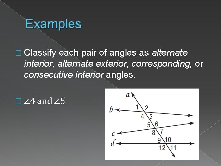 Examples � Classify each pair of angles as alternate interior, alternate exterior, corresponding, or consecutive interior angles. � ∠ 4 and ∠ 5