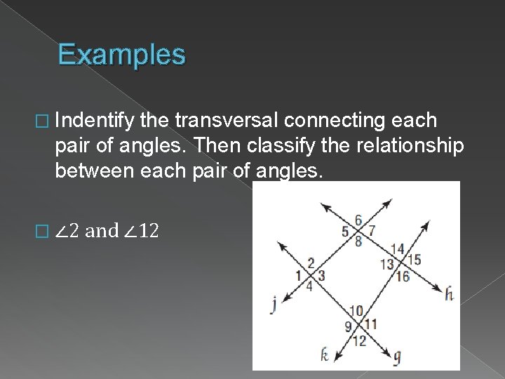 Examples � Indentify the transversal connecting each pair of angles. Then classify the relationship between each pair of angles. � ∠ 2 and ∠ 12