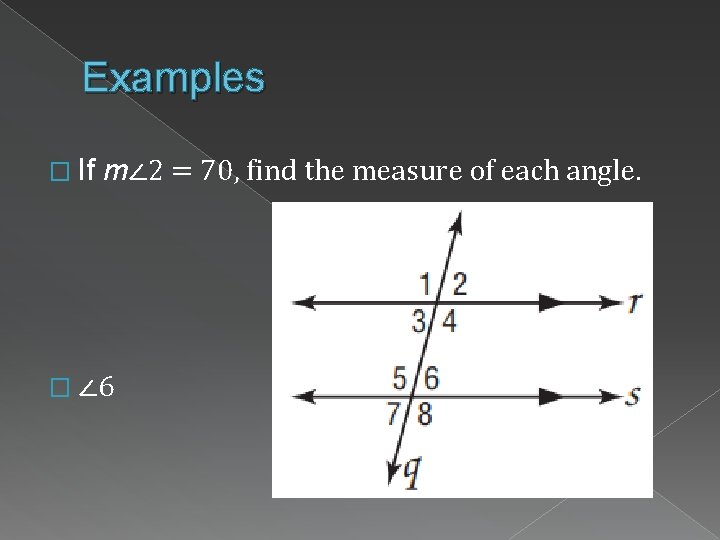 Examples � If m∠ 2 = 70, find the measure of each angle. � ∠ 6