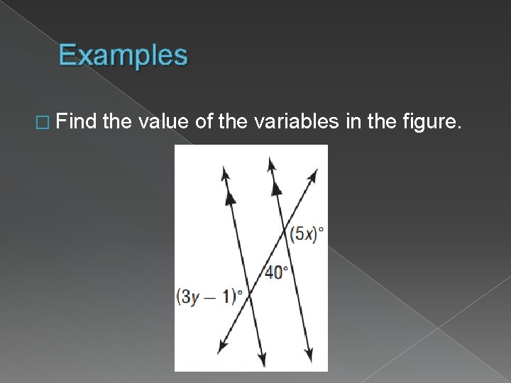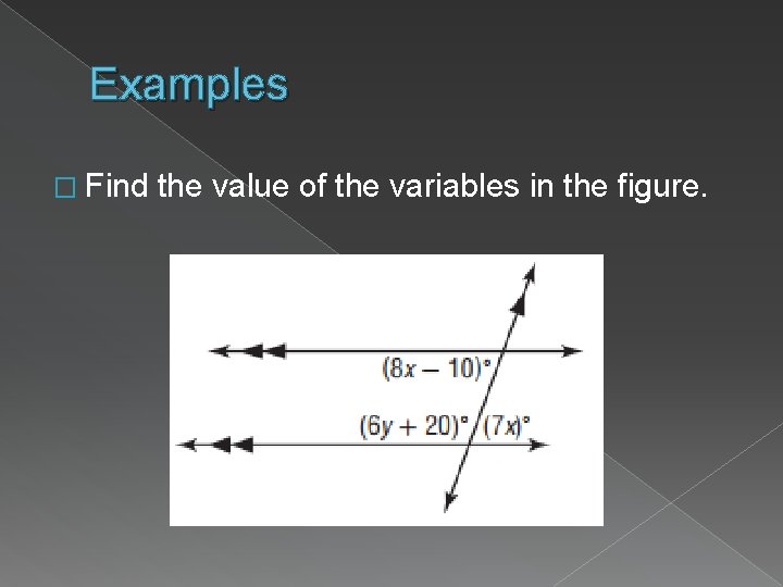 Examples � If m∠ 2 = 4 x + 7 and m∠ 7 = 5 x – 13, find x