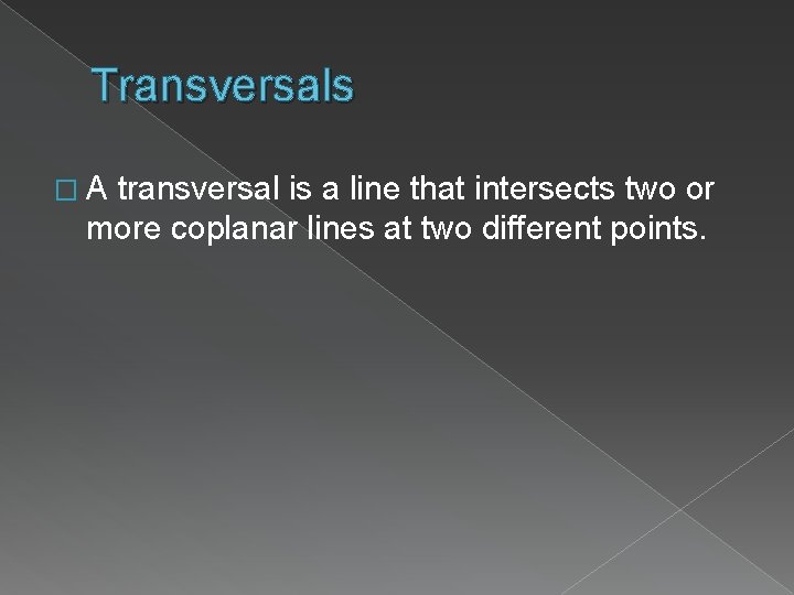 Transversals �A transversal is a line that intersects two or more coplanar lines at two different points.