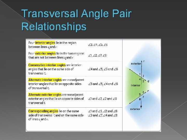 Examples � Indentify the transversal connecting each pair of angles. Then classify the relationship between each pair of angles. � ∠ 2 and ∠ 12