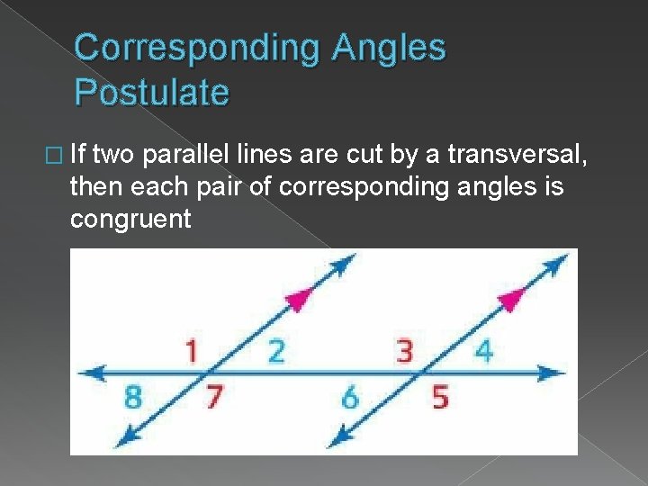 Corresponding Angles Postulate � If two parallel lines are cut by a transversal, then each pair of corresponding angles is congruent