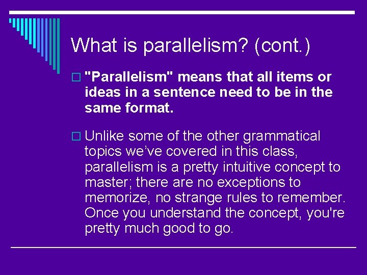 What is parallelism? (cont. ) o "Parallelism" means that all items or ideas in a sentence need to be in the same format. o Unlike some of the other grammatical topics we’ve covered in this class, parallelism is a pretty intuitive concept to master; there are no exceptions to memorize, no strange rules to remember. Once you understand the concept, you're pretty much good to go.