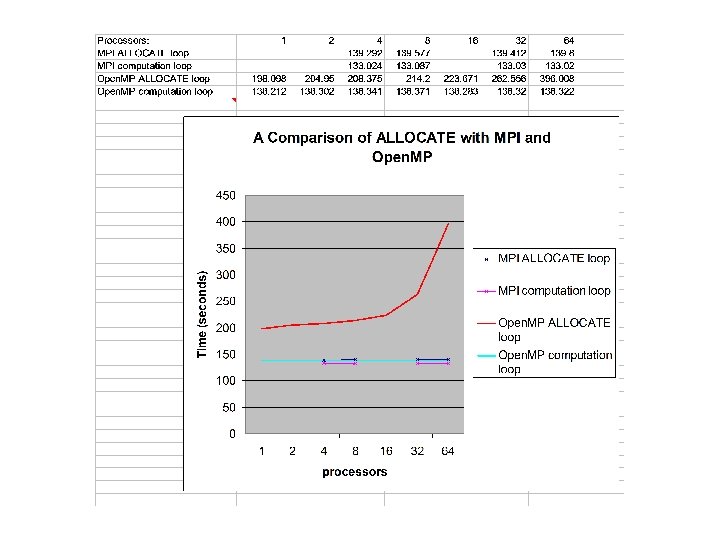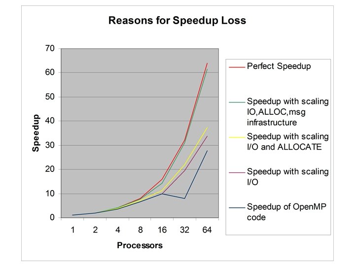 So Locality was not the whole problem! • The other problems turned out to be: – I/O which doesn’t scale – ALLOCATE which doesn’t scale – our non-scaling reduction implementation – our first-cut messaging infrastructure which, could be improved • Conclusion – Efficient loop parallel version may be feasible, avoiding Allocates and using scalable IO