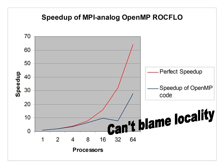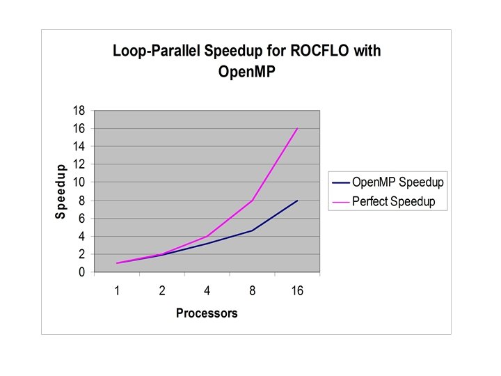 ROCFLO via Open. MP • Parallelization of ROCFLO using a loopparallel paradigm via Open. MP – Poor speedup compared with MPI version – Was locality the culprit? • Study conducted by Jay Hoeflinger – In collaboration with Fady Najjar