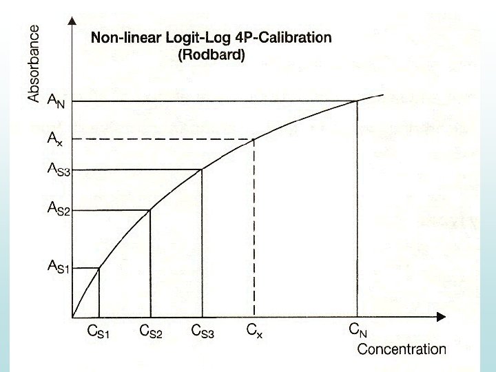 Způsoby kalibrace: Automatické analyzátory umožňují např. tyto typy kalibrace: • Lineární dvoubodovou – pro fotometrické metody • Nelineární Logit-log 3 P • Nelineární Logit-log 4 P • Nelineární Logit-log 5 P – pro turbidim. a imunoturb. m. • Nelineární exponenciální • Nelineární Spline • Isoenzym P • Isoenzym Q • Nelineární Point to Point • ISE (tříbodová)