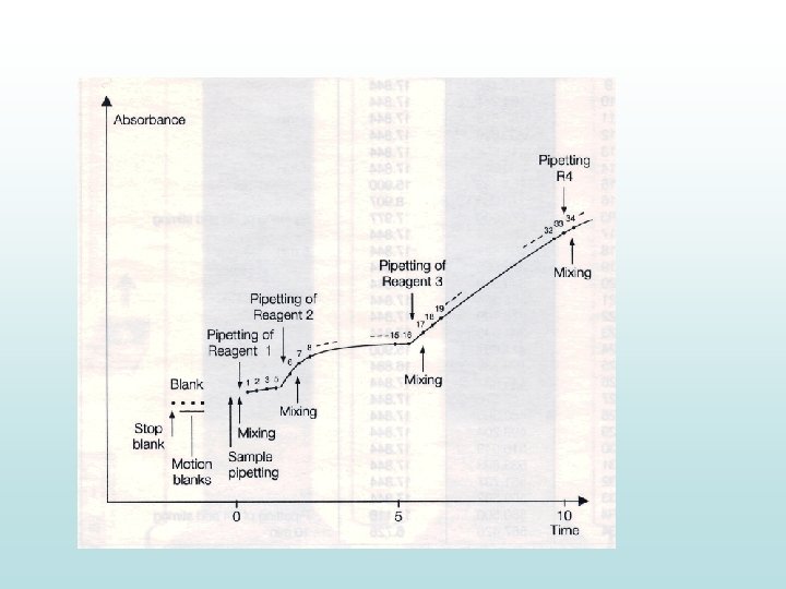 Měřící body reakce: • Absorbance reakčních roztoků v kyvetě je periodicky měřena po každém cyklu přístroje (kolem 20 s) během reakčního času ( 3 – 10 minut) • Přístroje jsou schopny přidávat vzorky a činidla v určité fázi reakčního času dle typu prováděného měření • Přesná specifikace měřícím bodem