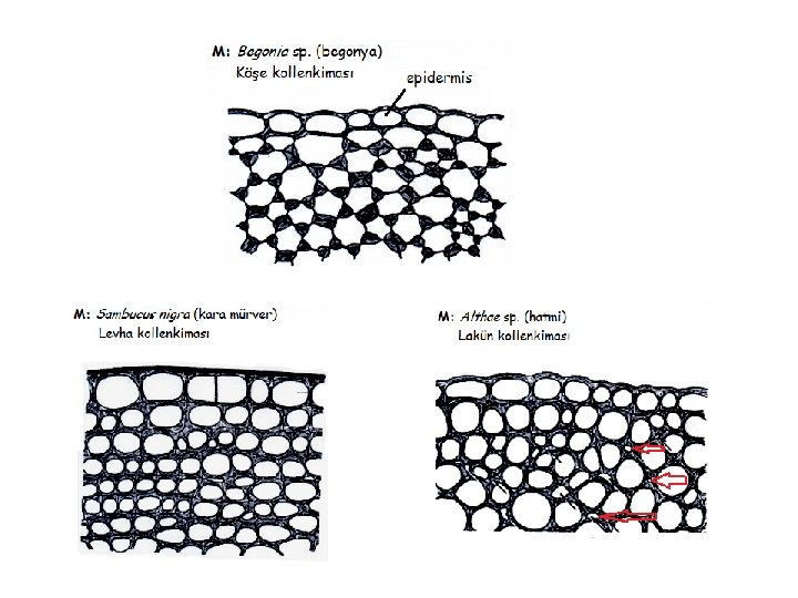 2. Lamellar kollenkima (Plak ya da levha kollenkiması): Bu tipte çeper kalınlaşmaları hücrelerin teğetsel çeperlerinde görülmekte ve lameller oluşturmaktadır. Materyal: Sambucus nigra (kara mürver), levha kollenkiması (gövde, enine kesit)